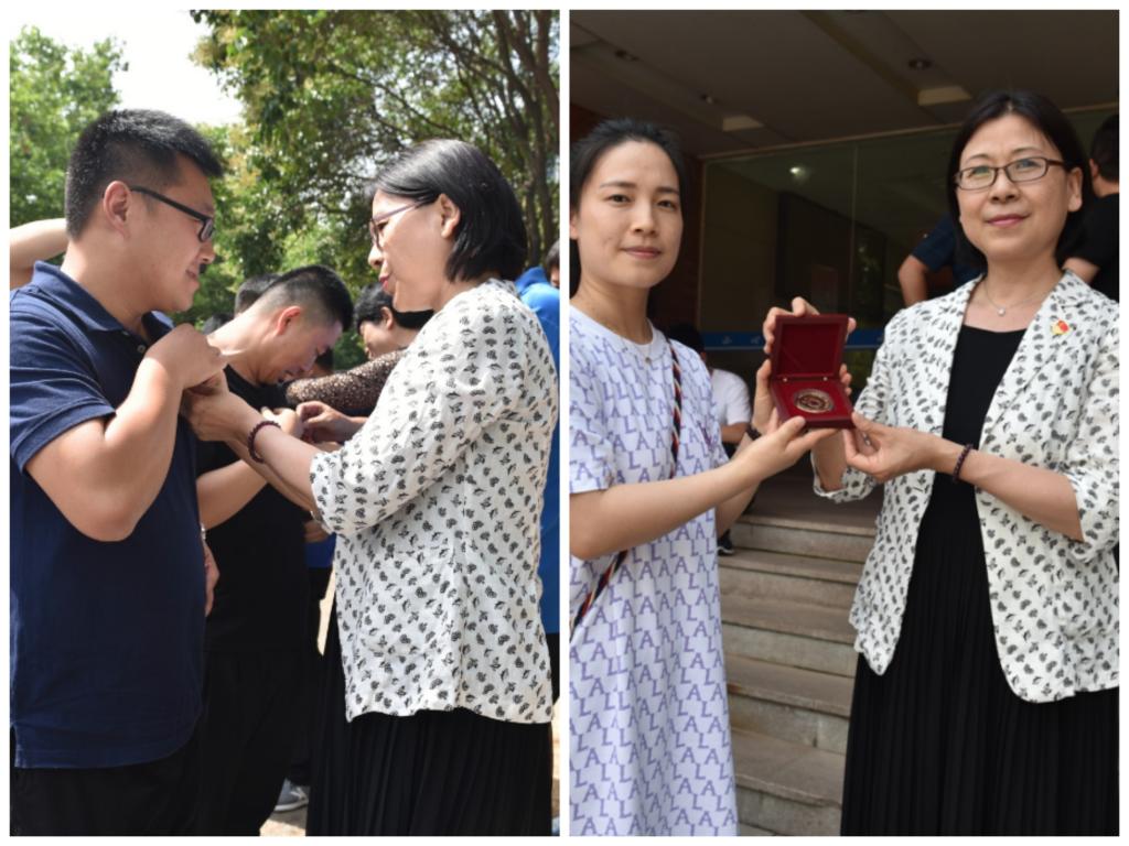 李欣副校长为校友佩戴校徽,校友赠送纪念徽章