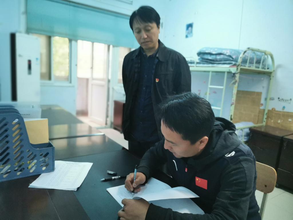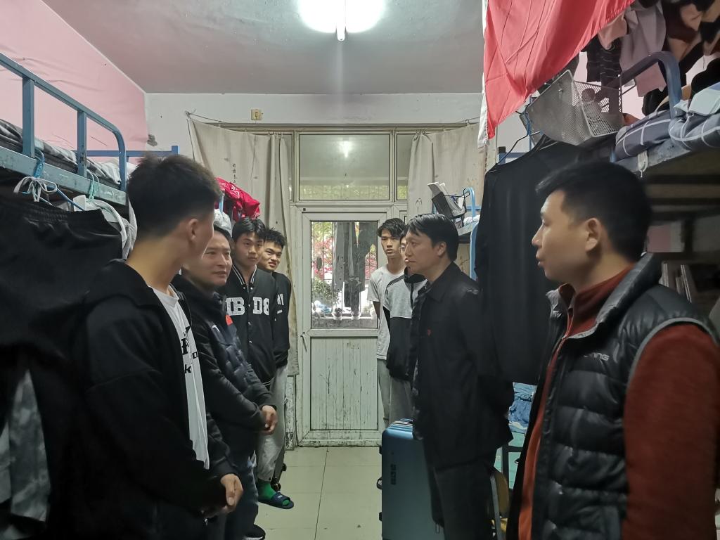 4月10日晚18:00,学生副处长张迎松深入国基生活区查看辅导员值班情况,并和当班的beat365平台官方网站学工办主任李庆功、辅导员王宁涛共同走访了学生宿舍。