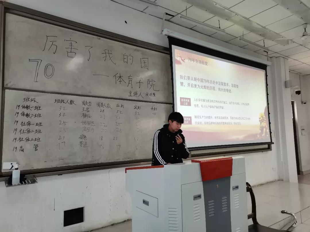 团课开始,主讲人18级社会体育二班闵丽雯带领同学们回顾了建国70周年以来,中国砥砺奋进的发展史:从建国初期温饱不足,到初步建成小康社会迈向繁荣富强;之后,主讲人以“厉害了,我的国”为主线,从五个方面讲述了此次团课的内容,并强调中国将在共产党的领导下走向辉煌。