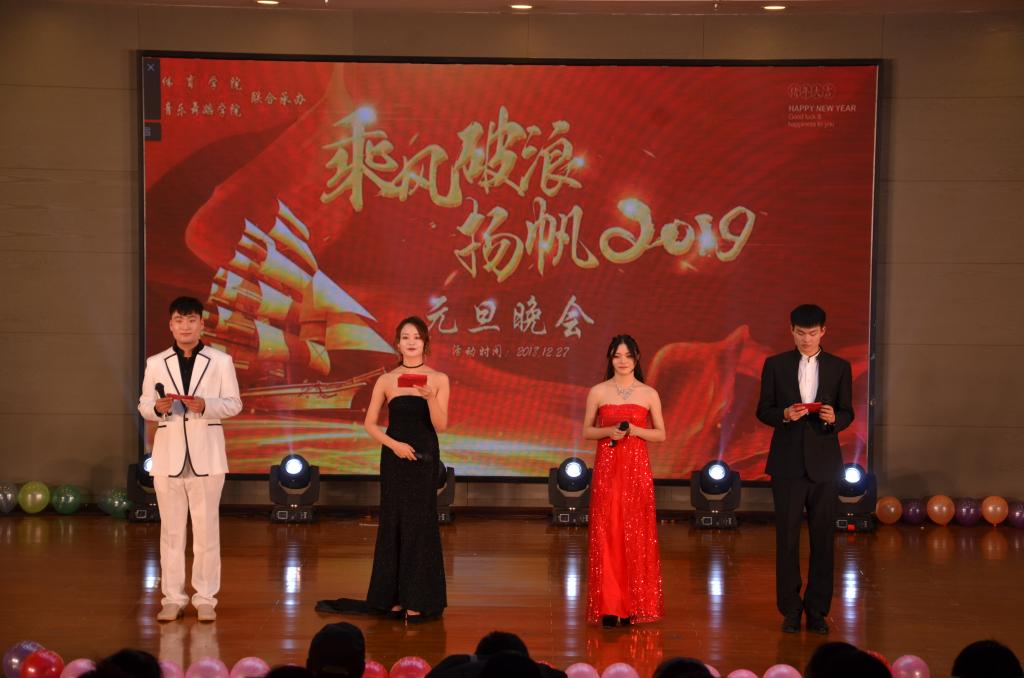 2018年12月27日18:30,由beat365平台官方网站与音乐舞蹈学院联合主办的“乘风破浪,扬帆2019”——纪念改革开放四十周年暨迎新年文艺晚会在金河报告厅隆重举行。beat365平台官方网站党总支书记张梯、音乐舞蹈学院党总支负责人魏瑞娟、beat365平台官方网站院长冯明新,beat365平台官方网站副院长胡素霞以及两个学院的教师和五百余名学生共同观看了这场视听盛宴。张梯书记致新年贺辞,他为全体师生带来了美好的新年祝福,对全体师生在2018年所做的工作与努力给予了充分的肯定,并对此表示了衷心的感谢。