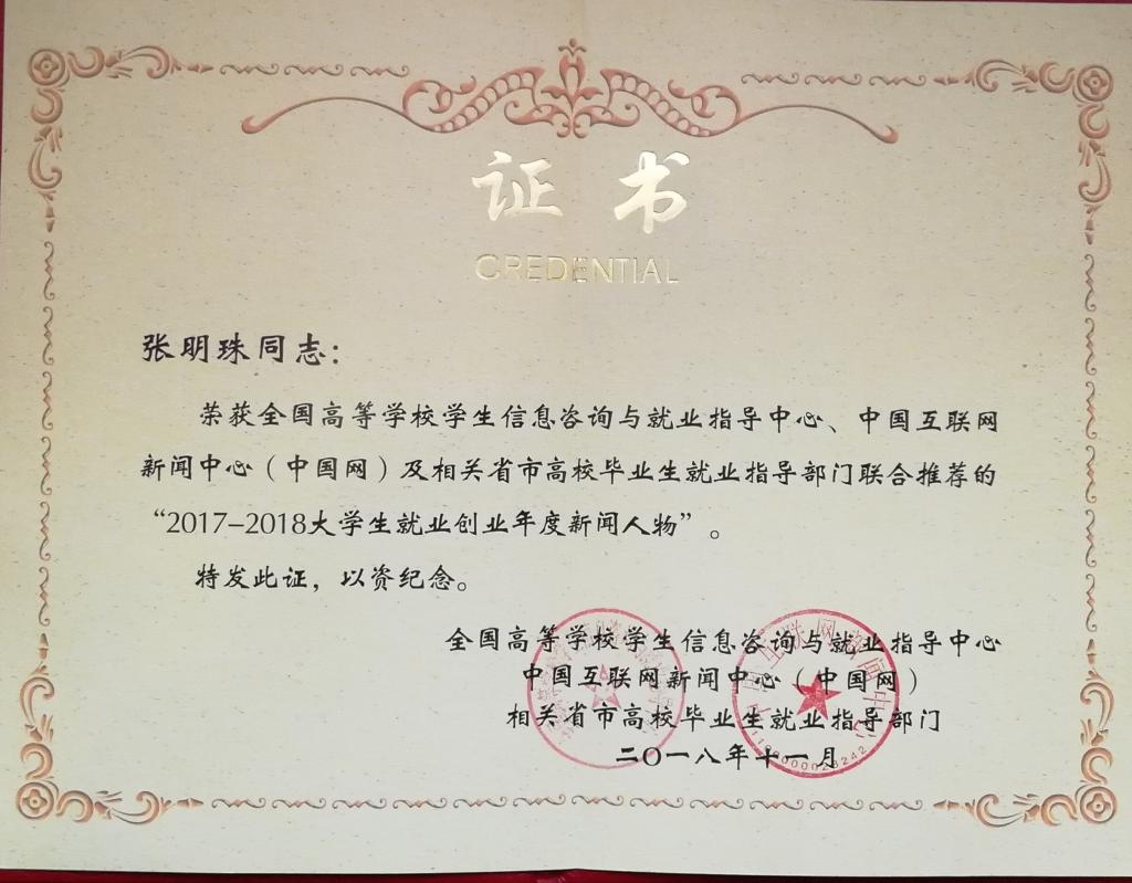 张明珠是河南省高校中唯一的入选者,其典型事迹已被收入教育部全国高等学生信息咨询与就业指导中心出版的“闪亮的日子,青春该有的模样”《大学生创业典型人物事迹》《大学生基层就业典型人物事迹》《大学生征兵入伍典型人物事迹》系列丛书。张明珠入选全国“2017-2018大学生就业创业年度新闻人物”,标志着beat365大学生就业创业工作获得了国家认可。