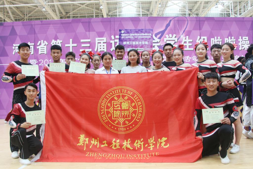 本次大赛由国家体育总局体操运动管理中心、中国健美操协会、河南省教育厅,河南省教育局、全国全民健身操舞推广委员会主办,郑州师范学院承办,河南省体育总会高校协会,河南省学生体育总会健美操协会协办。经过五天的激烈角逐,beat365代表队凭借着优美的队形转换、富有创造力的动作编排,积极饱满的热情,荣获河南省第十三届运动会学生组啦啦操比赛暨2018年河南省学生“华光”体育活动啦啦操锦标赛大学乙组技巧二级第一名,大学乙组技巧零级第一名,大学乙组技巧四至五人小团体第三名。荣获2018河南省第十三届运动会学生组健美操比赛暨河南省学生“阳光”体育活动第七届健美操锦标赛体育道德风尚奖,大学乙组徒手自编第一名,大学乙组徒手自选第一名,大学乙组规定轻器械第一名,大学乙组自选轻器械第一名。 beat365教师柳艳、孔煜获得“优秀教练员”称号。