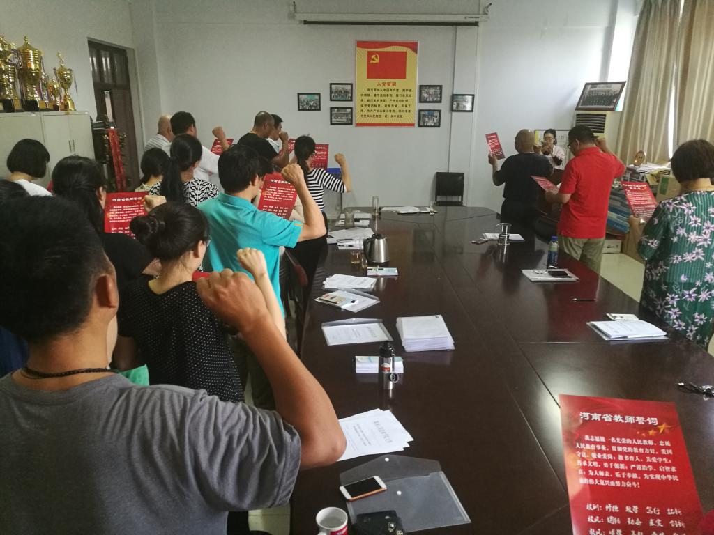 张梯书记最后强调,全院教师要认真学习领会此次会议精神,围绕学院年度工作目标任务,上下齐心协力,在今后工作中突出重点,强化保障落实,推进学院事业发展再上新台阶,为学校发展做出应有贡献。会后带领全体师生重新宣读河南省教师誓词。(文:张楠 图:李庆功)