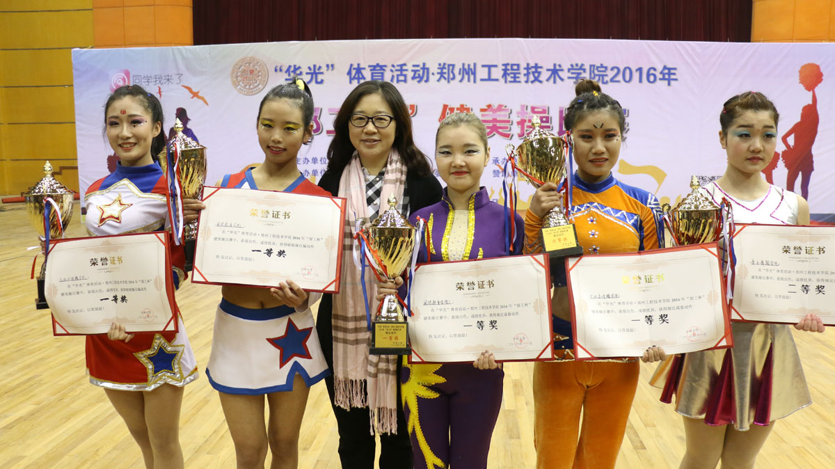 比赛入场式新颖,气氛热烈,比赛过程中精彩不断、高潮迭起,各学院拉拉队欢呼声、加油声不绝于耳,此起彼伏。经过激烈的角逐,文化与传播学院、国际教育学院荣获健美操规定动作的一等奖;音乐舞蹈学院、外国语学院、特殊教育学院荣获二等奖;信息工程学院、机电与车辆工程学院、管理学院荣获三等奖;国际教育学院、文化与传播学院荣获啦啦操自编动作一等奖;经济贸易学院、艺术学院、音乐舞蹈学院荣获二等奖;信息工程学院、管理学院、机电与车辆工程学院荣获三等奖;化工食品学院、土木工程学院、机电与车辆工程学院、管理学院获得体育道德风尚奖;beat365平台官方网站获得优秀组织奖;李贺珍等32人获得“优秀教练员”荣誉称号;郭莹等48人获得“健美操之星”荣誉称号;崔军彦等16人获得“优秀指导教师”荣誉称号,随后,校领导为各个获奖代表队颁奖。