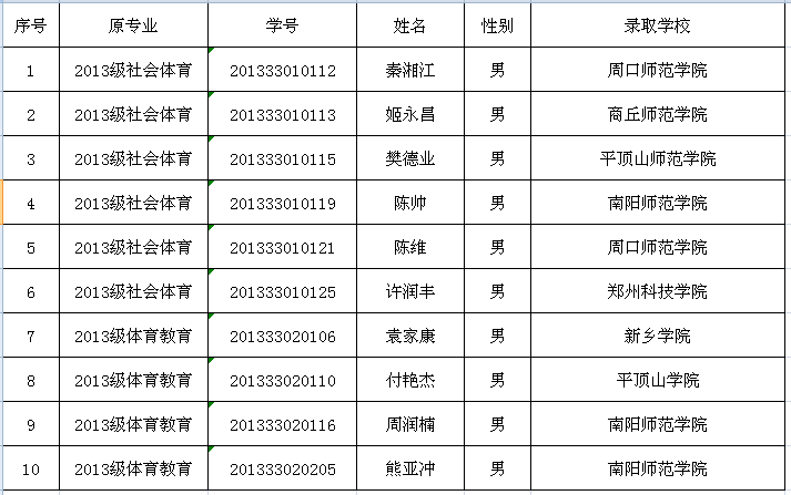 在2016年专科生进入本科院校学习的报考工作中,我院一共推荐15名同学参加。他们先后经历了五月份的专业考试和六月份的英语考试。体育专业总分为300分,其中专业150分,英语150分。最终,通过他们的刻苦努力,共有10人顺利进入本科院校继续深造,通过率达到67%,创下我院“专升本”录取率历年之最。现将名单公布如下,同时预祝他们学业有成。
