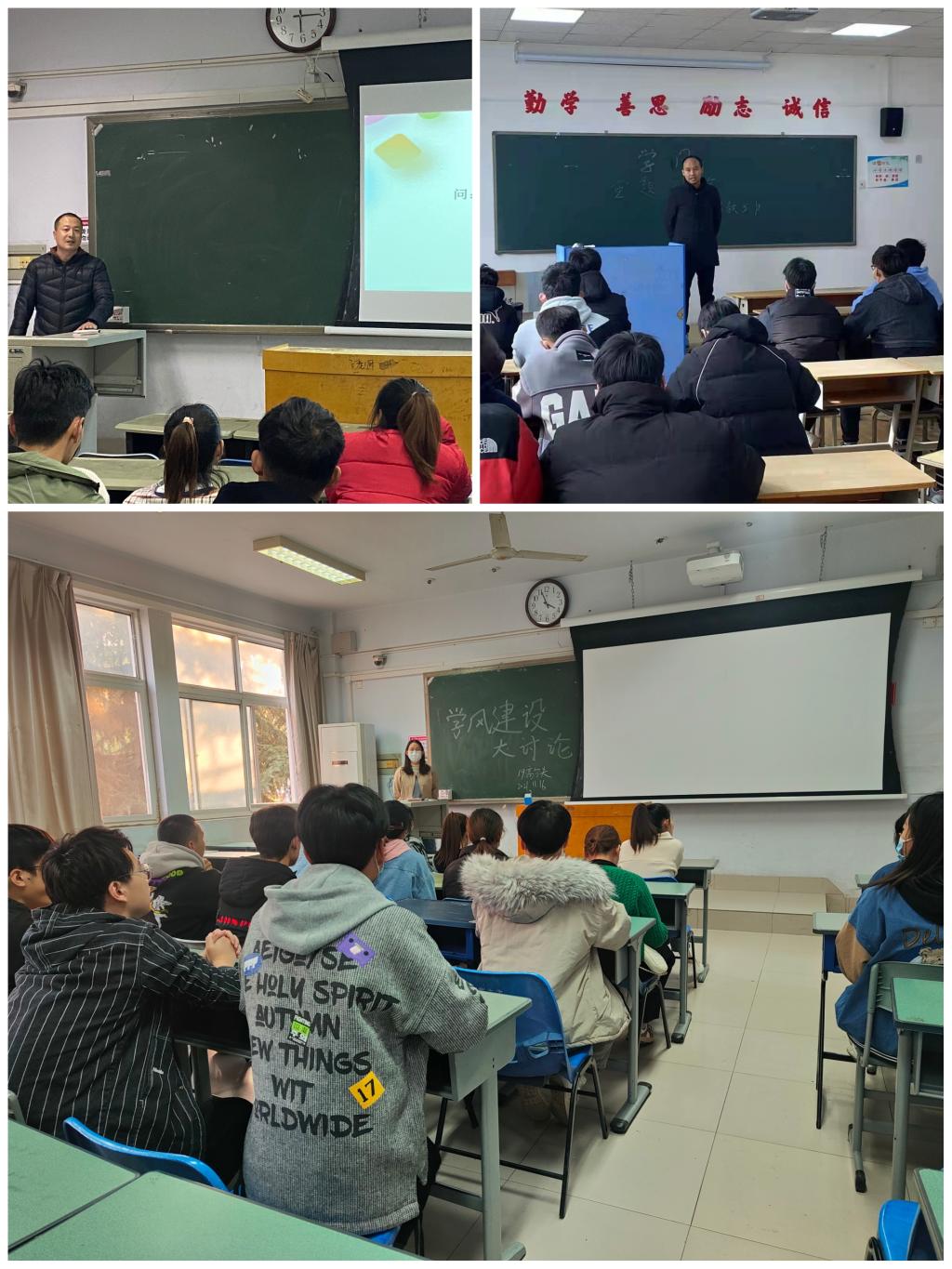11月22日-24日,beat365平台官方网站各班班导师深入班级,组织各班学生开展以“勤学、善思、励志、诚信”为主题的学风建设主题班会。
