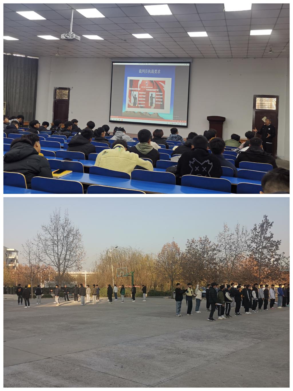 随后,培训工作开始。讲师团老师分别从理论《守初心,担使命做优秀裁判员》、《篮球规则》和临场实践等方面,进行知识通讲和临场执裁示范,通过实际案例视频资料进一步认知和系统了解篮球规则的内容和执裁技巧。老师们鼓励参训同学,认真学习篮球裁判相关知识,掌握篮球临场执裁能力,早日成为篮球竞赛场上的“法官”,为篮球事业的发展贡献力量。