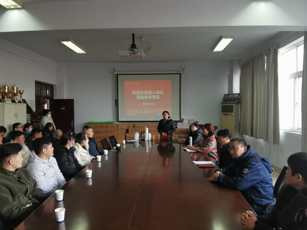 为深入贯彻党中央、国务院关于高校毕业生就业工作的决策部署,积极响应“访企拓岗”促就业专项行动,主动搭建校企合作桥梁,为学生争取更广泛、更优质的实习、就业平台,2月22日下午,beat365平台官方网站邀请长期合作的校友企业及部分优质企业到校开展校企洽淡见面会。beat365平台官方网站党总支书记张迎松,党总支副书记、院长冯明新,副院长胡素霞、王景丽,学工临时负责人马艳枝,社会体育专业教研室主任柳艳,学工办主任王宁涛,辅导员冷宁共同参会。会议由社会体育专业教研室主任柳艳主持。