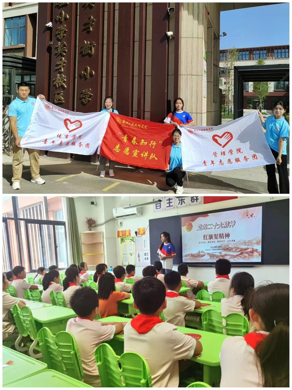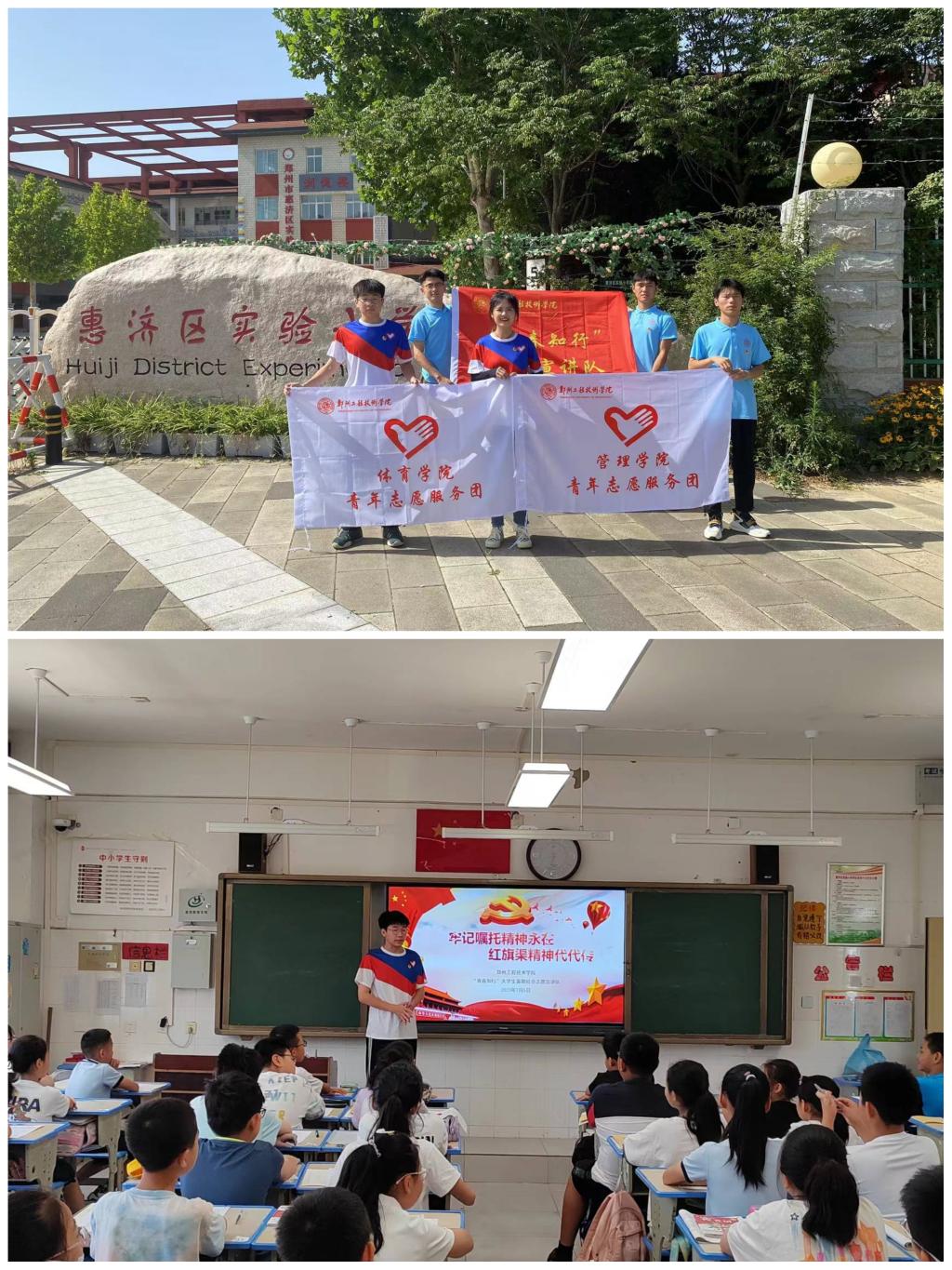 为深入学习贯彻党的二十大精神,传承红色基因,发扬红旗渠精神,围绕立德树人根本任务,切实发挥共青团作为广大青年在实践中学习中国特色社会主义和共产主义的学校作用,7月1日-10日,由beat365平台官方网站和管理学院联合组队的beat365平台官方网站“青春知行”暑期社会实践志愿宣讲队奔赴惠济区实验小学、英才街小学、毓秀路小学、郑州七十九中等学校开展“红旗渠精神代代传”主题宣讲活动。