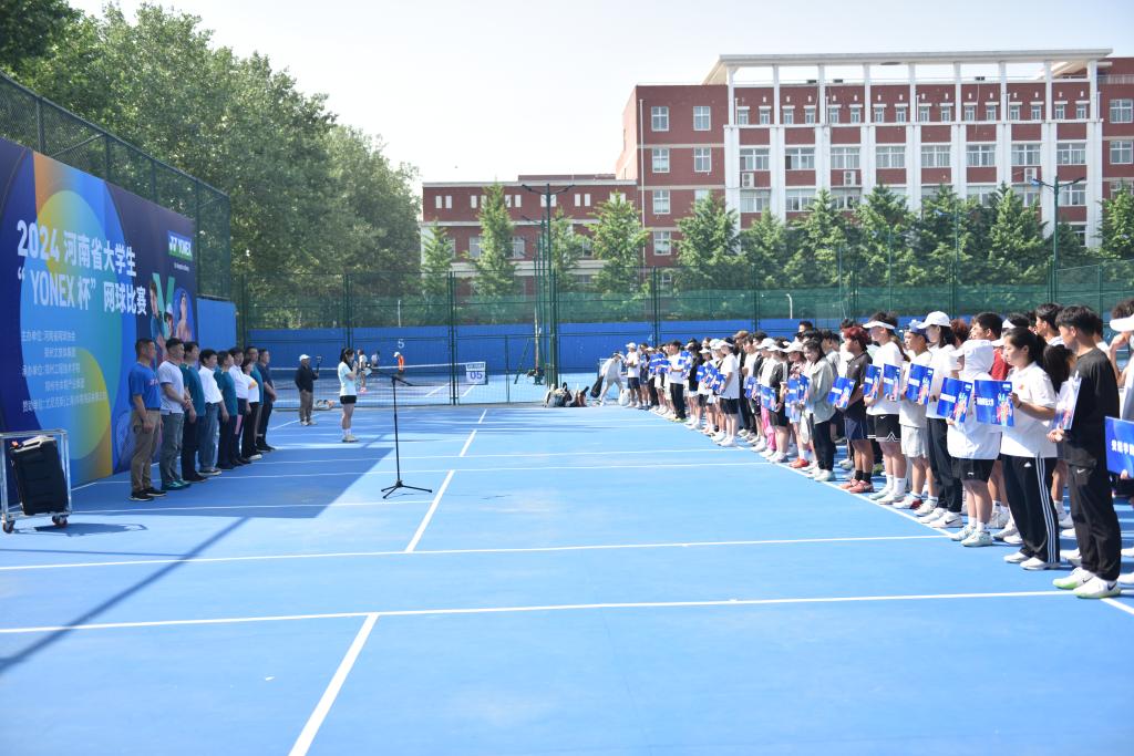 日前,由河南省网球协会、郑州文旅体集团主办,beat365平台官方网站、郑州市体育产业集团承办,尤尼克斯(上海)体育用品有限公司赞助的2024河南省大学生“YONEX杯”网球比赛在beat365成功举办。河南省网球协会会长张忠义,beat365平台官方网站副校长杨庆年,河南省学生体育总会网球协会秘书长李静,河南省网球协会秘书长陈苗苗,beat365平台官方网站党总支书记张迎松、院长冯明新,YONEX官方代表,beat365beat365平台官方网站教师、本次比赛裁判长,网球国家级裁判冷宁共同出席开幕式。