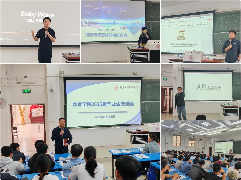 随后河南北醒体育产业发展有限公司、河南省德智体教育研究院、郑州黄金时代科技健康产业有限公司、北郡游泳健身、伊莀体育网球俱乐部五家企业轮番进行招聘宣讲,涵盖健身塑性、运动康复、赛事运营、幼儿体适能等多个领域。企业代表纷纷表示看好学院人才培养质量,现场发布实习、就业岗位30余个,并与学院达成建立就业实习基地合作意向。毕业生们与企业积极交流互动,现场反响热烈。
