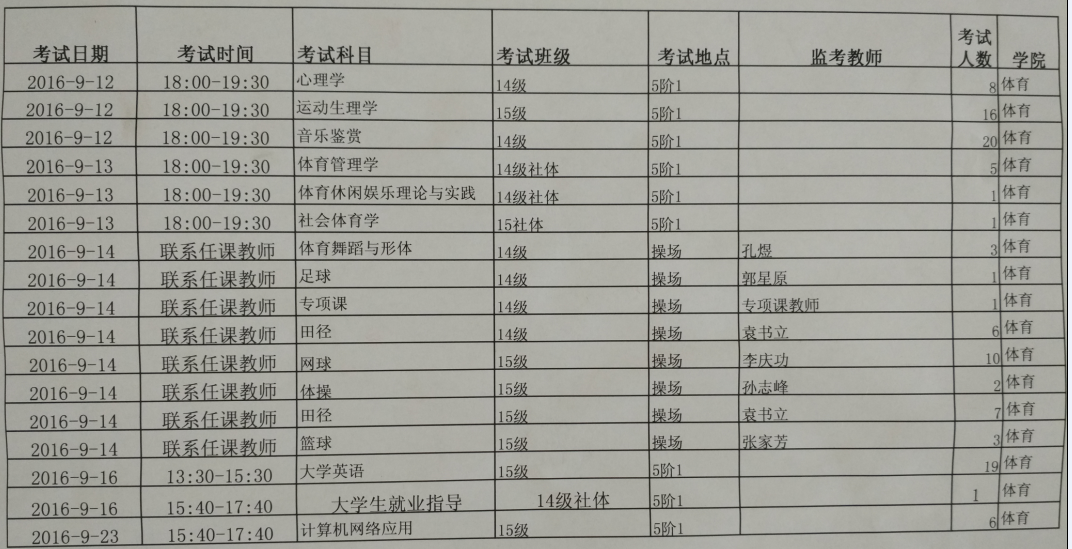 根据学校教务处近期教学安排,结合我院实际情况,现就上学期期末考试补考作出以下安排,请各班及时转达到相关同学,并做好复习准备。(因9月16日中秋节放假,原定补考时间调整至9月18日,具体时间、地点不变。)