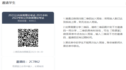 2021级本科体育(4)、2022级专科大学体育(2)的学生,请扫码进班,已经扫码进班的同学请尽快修改本人实名,格式务必修改为:体育任课教师姓名+本人姓名,参考修改方式:https://www.yuketang.cn/help?detail=176所有同学进班之后,会发布试卷;考试时间:6月19日—6月21日这个时间段都可进入考试,请同学们相互转告,抓紧扫码进班,并实名准备考试;考试时间为90分钟,切记:考试一旦开始,不得退出!(注意:即使退出也会计时),直到考试结束、提交成功为止。请同学们按时参加线上考试,逾期不再组织补考。