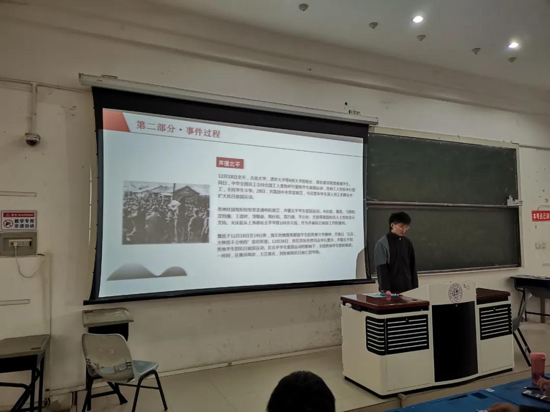 为增进大家对"一二·九"运动的认识,2019级体育教育一班王雪滢和2019级体育教育二班于泳波担任本次活动的主讲人,向大家讲解了相关的历史背景和教育意义,并在宣讲结束后组织在场的同学们进行了"一二·九"运动知识竞赛。