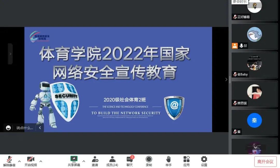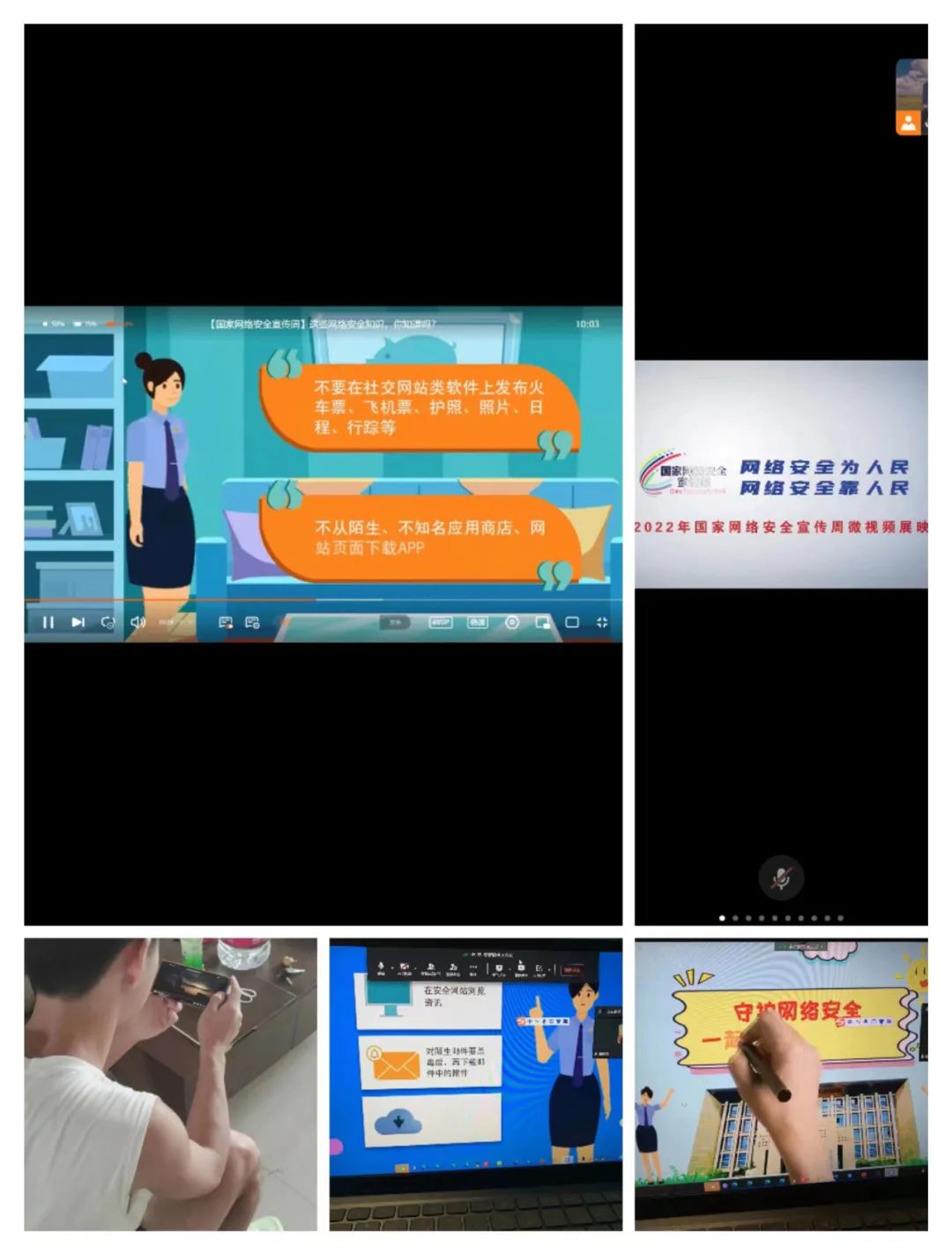 活动期间,学院组织学习了习近平总书记系列重要讲话精神、重要批示精神和总体国家安全观,学习宣传习近平总书记网络强国战略思想。学生各团支部组织开展主题班会,积极参加“全国大学生网络安全知识竞赛”,通过大赛进一步提升学生们的网络安全意识;组织全体教师观看网络安全纪录片并讨论学习体会。